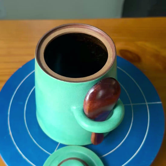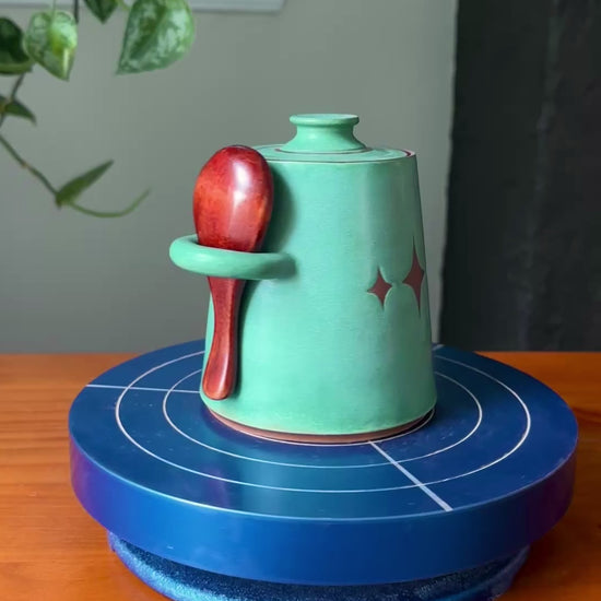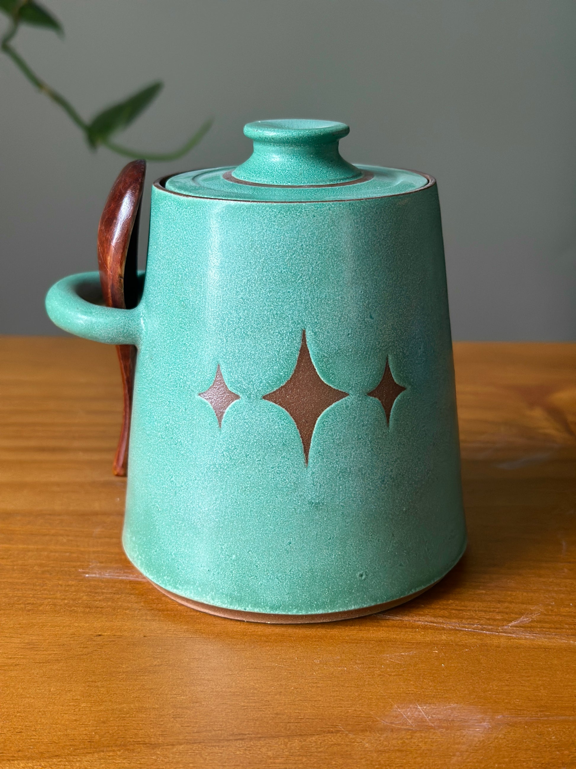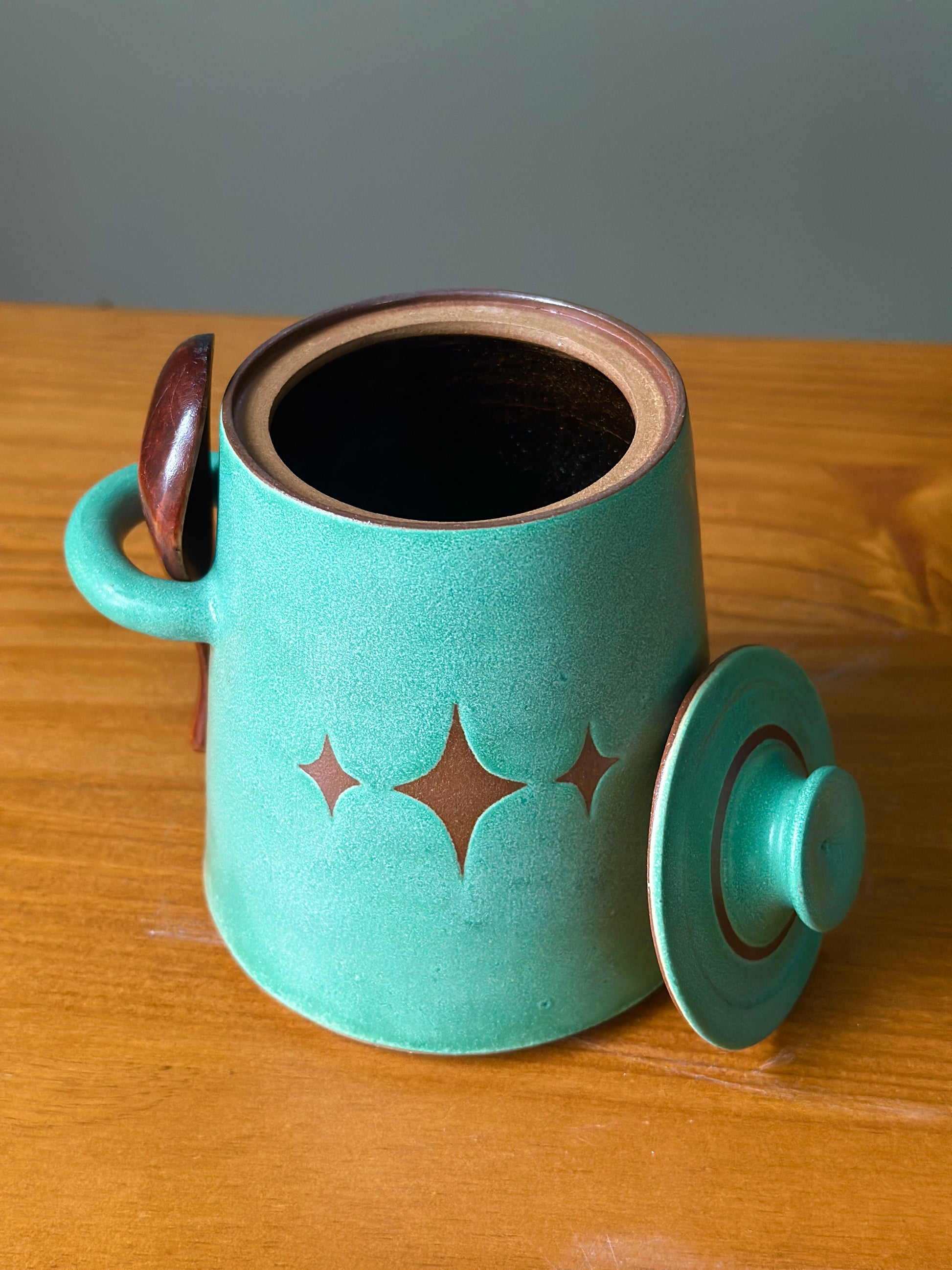 From the tail end of my mid century summer collection this gal never got listed but her coffee jar counterpart was snatched up. Left behind but just The Sweetest lLittle Mid-Century Sugar Jar anyone could ask for! Another pairing of Satin Patina on Walnut with a super sparkly cosmic tea dust glaze inside. We love her!