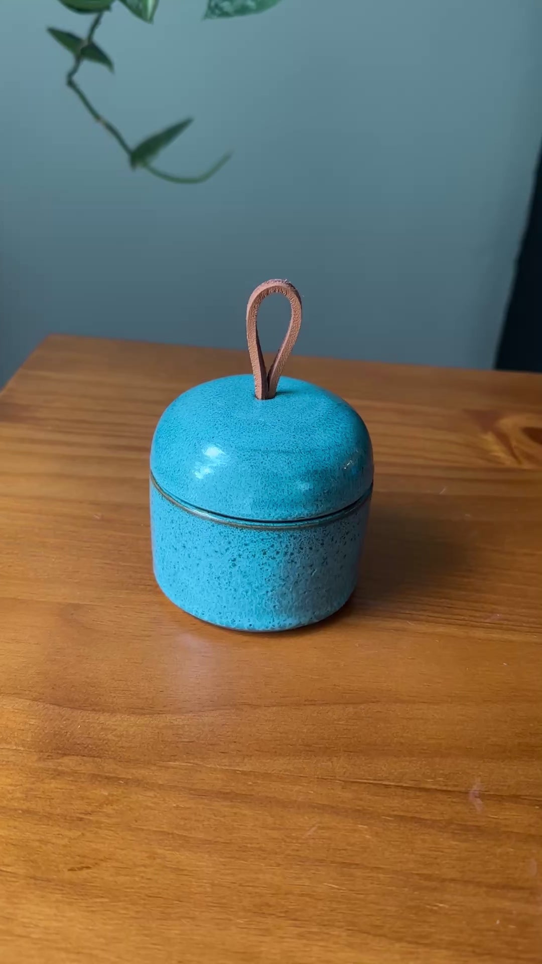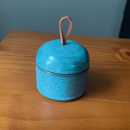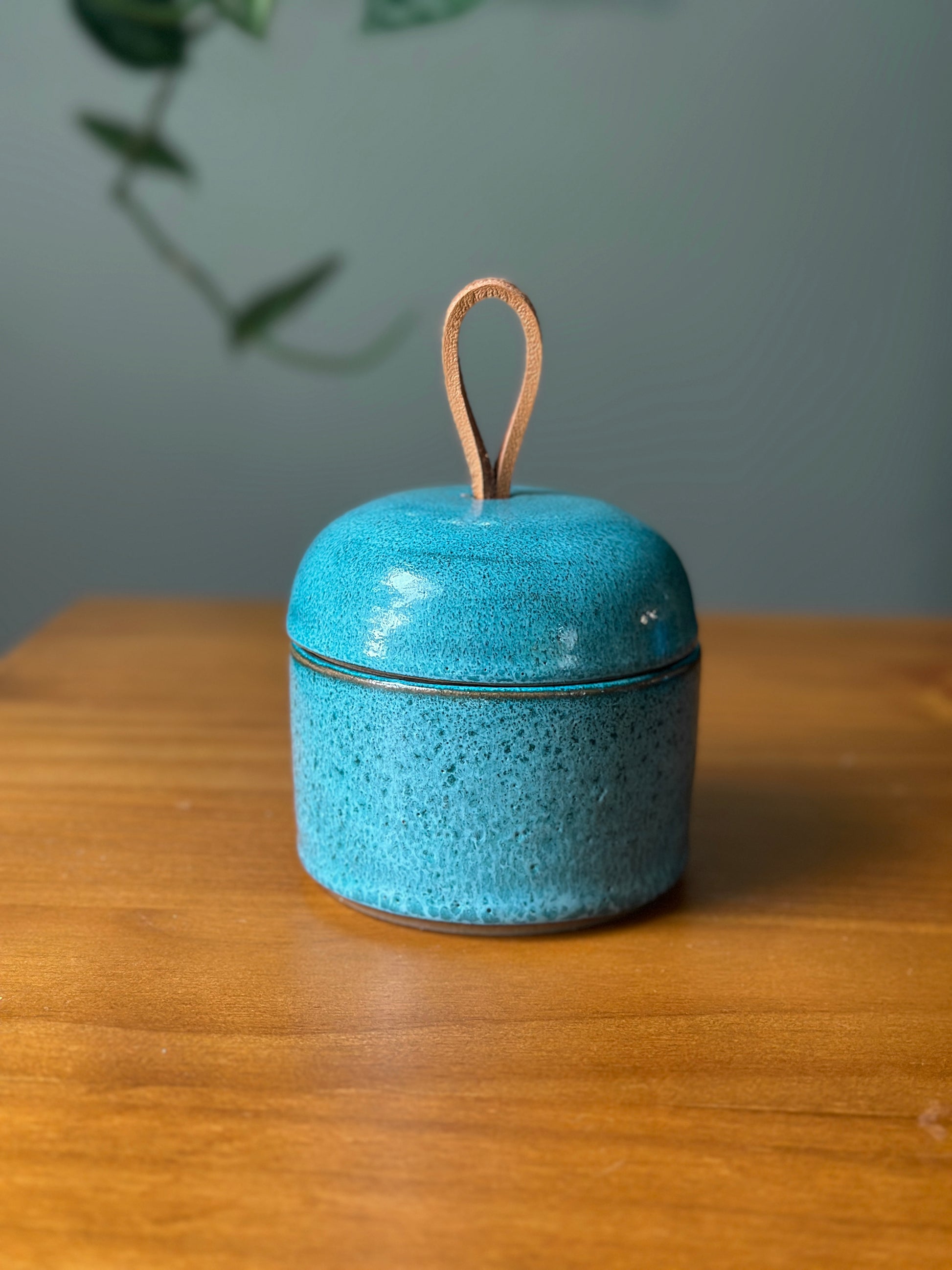 She is made from walnut clay (my fave) a funky floating teal glaze, and topped in leather babayyyy!
